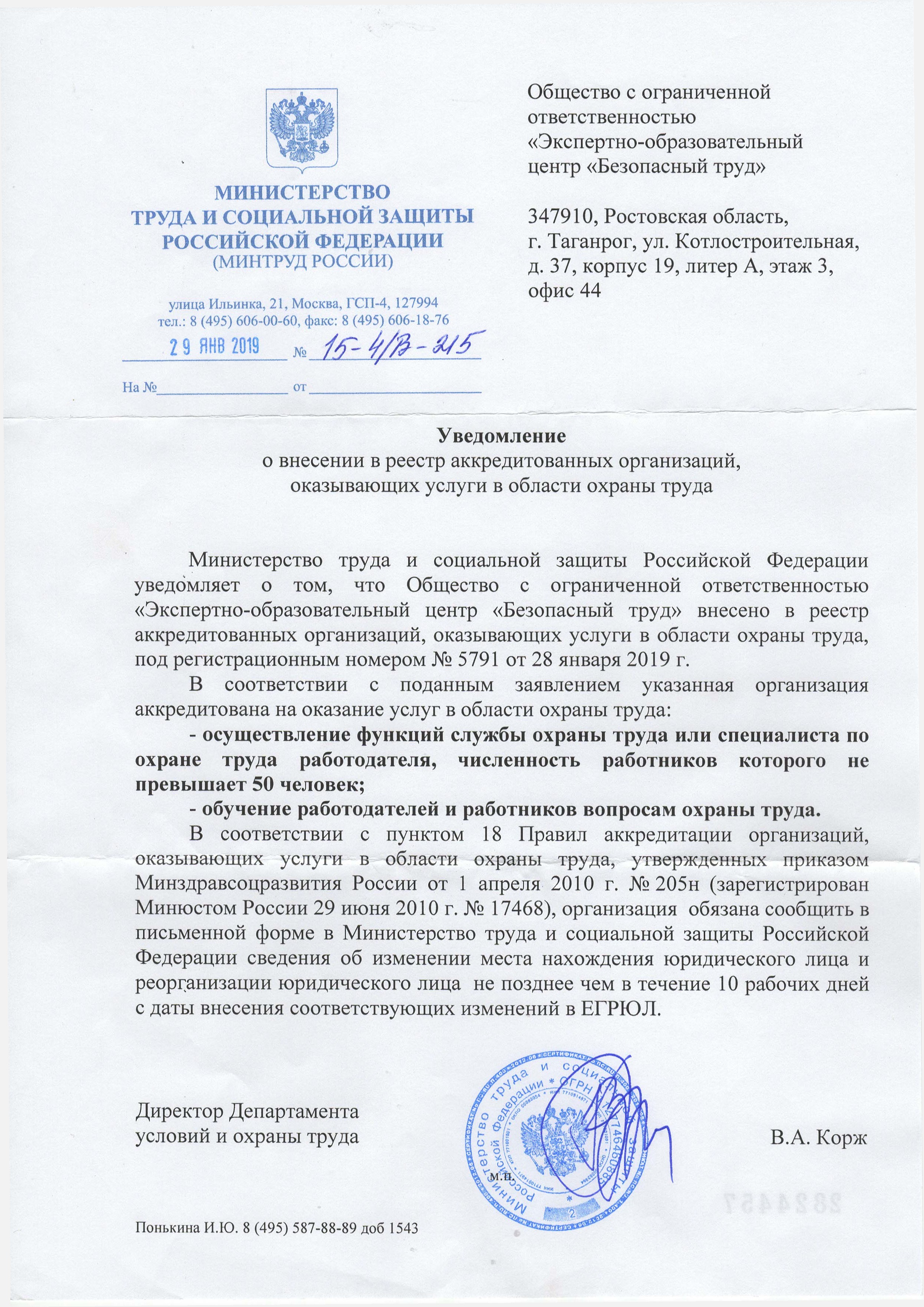 о внесении в реестр аккредитованных организаций, оказывающих услуги в области охраны труда